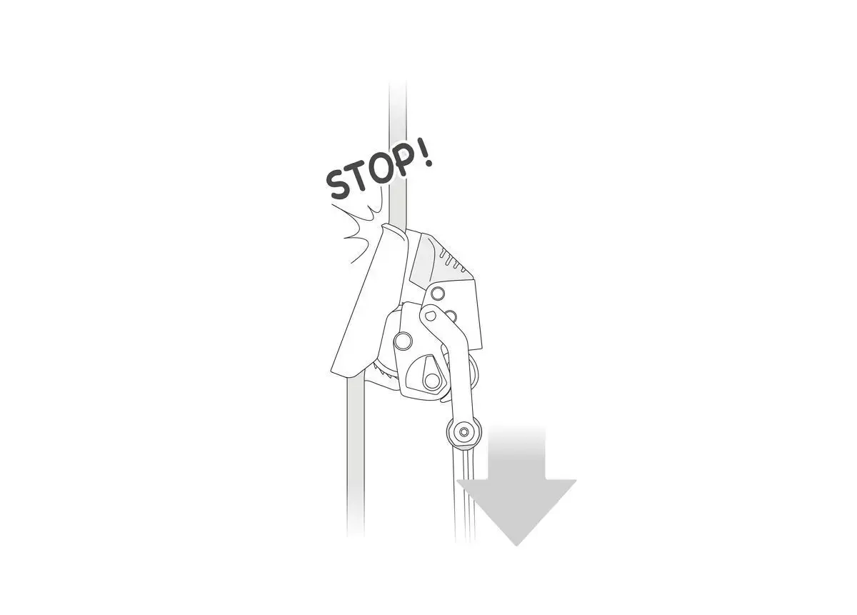 W razie upadku lub niekontrolowanego zjazdu (powyżej dwóch metrów na sekundę), przyrząd blokuje się na linie i zatrzymuje użytkownika.