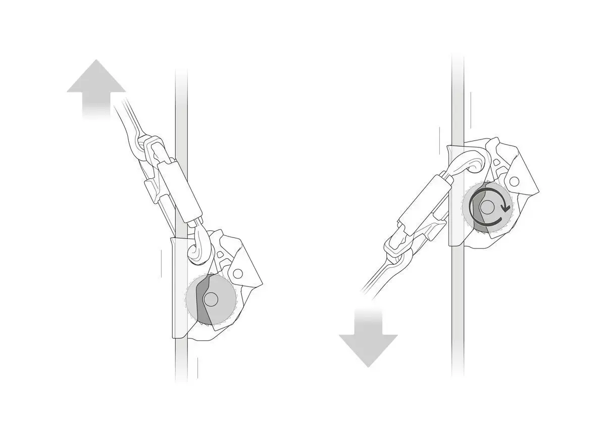 W razie upadku lub niekontrolowanego zjazdu (powyżej dwóch metrów na sekundę), przyrząd blokuje się na linie i zatrzymuje użytkownika.